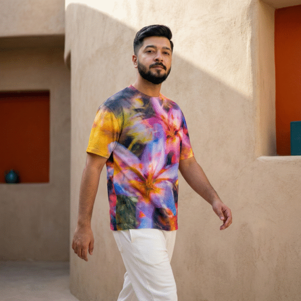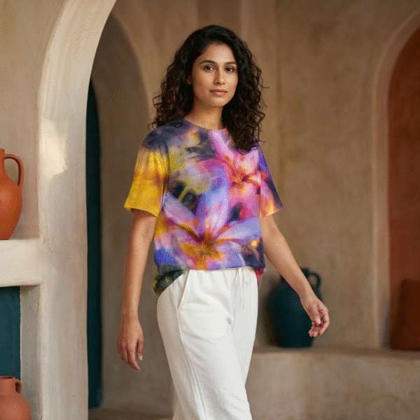 Float into the surreal with the Lily Haze Oversized Tee, where floral fantasies bloom in blurred hues of violet, amber, and indigo. This dreamy visual wash feels like walking through a painting where lilies whisper stories and sunsets melt into fabric.